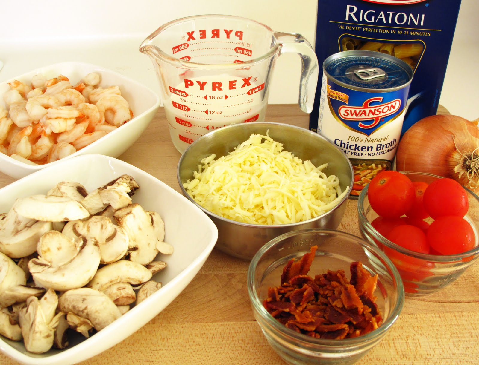 Melt 4 Tbs. butter in the bottom of a large skillet over medium-high heat. Add chopped yellow onion and saute until tender. Add de-tailed shrimp and chopped mushrooms to the pan, cooking until mushrooms become tender. Remove shrimp mixture form pan and set aside. In the same pan, whisk together the olive oil and the flour for 2-4 minutes. Add the salt, pepper and chicken or vegetable broth, whisking until well combined and beginning to thicken. Add cream and monterey jack cheese, stirring until well melted. Return the shrimp mixture to the pan and coat thoroughly with the cheese sauce. Pour over cooked rigatoni, stir in chopped tomatoes and bacon. Serve immediately and enjoy!